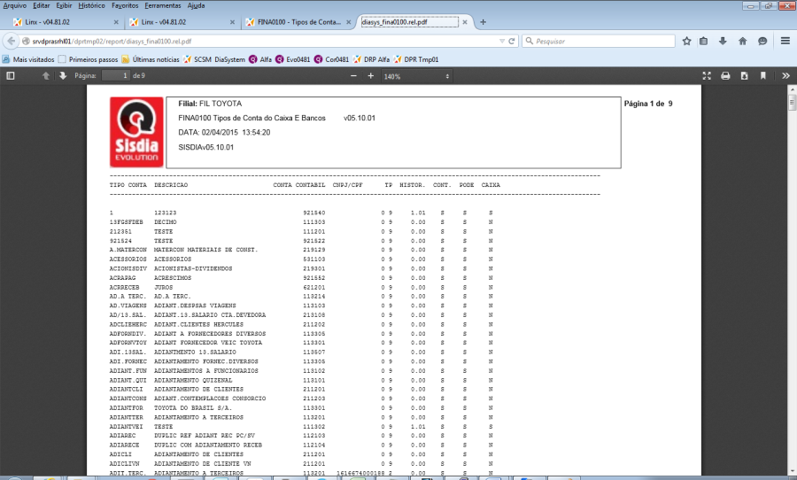 Configuração de ambiente para arquivos PDF no Sisdia Evolution. A partir da versão v5.10 foi desenvolvido um processo específico para o SISDIA EVOLUTION, para salvar automaticamente os relatórios em PDF e abri-los de forma automática utilizando o Adobe Reader, diretamente a partir do Browser de acesso ao sistema. Além de salvar os relatórios em PDF, o novo processo também habilitou a impressão da Ficha em PDF para o LinxMaq. O relatório salvo em PDF possui o mesmo formato do relatório texto, inclusive obedecendo às quebras de página. O cabeçalho de página será substituído, conforme exemplo na imagem abaixo, com o logotipo podendo ser substituído pelo logo da empresa.