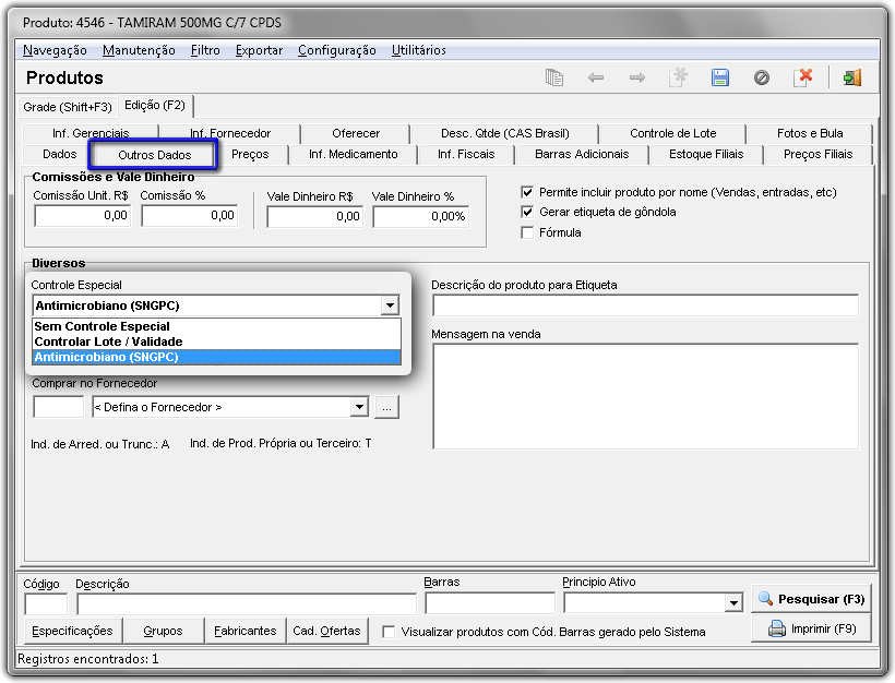 Figura 02 - Cadastro de Produtos - Aba Outros Dados 02 - Se o produto voltou com o erro em questão e em seu cadastro está como Antimicrobiano (SNGPC) então deve ser alterado para Controlado, para isso no campo "controle especial" coloque "sem controle especial", vá na aba Dados e no grupo do produto, coloque um grupo de controlados, se no cadastro ele estava como controlado, então retire ele do grupo, vá na aba Outros Dados e coloque no campo "controle especial", o valor "Antimicrobiano(SNGPC)". 03 - Porém caso o controle especial dele realmente esteja errado na Anvisa, então a correção deve ser feita através da finalização do inventário e transmissão de outro. |