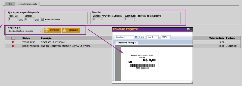 - Neste modelo são impressos o EAN e a descrição do produto (impressão em formulário tamanho A4) - abaixo exemplo de impressão.