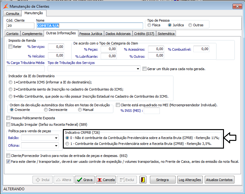 No Sistema, Menu (55910): Faturamento > Manutenção Clientes > Cadastro de Clientes, na aba < Manutenção > Outras informações>, foi criado o quadro "Indicativo CRPRB (726)" com estas duas opções: