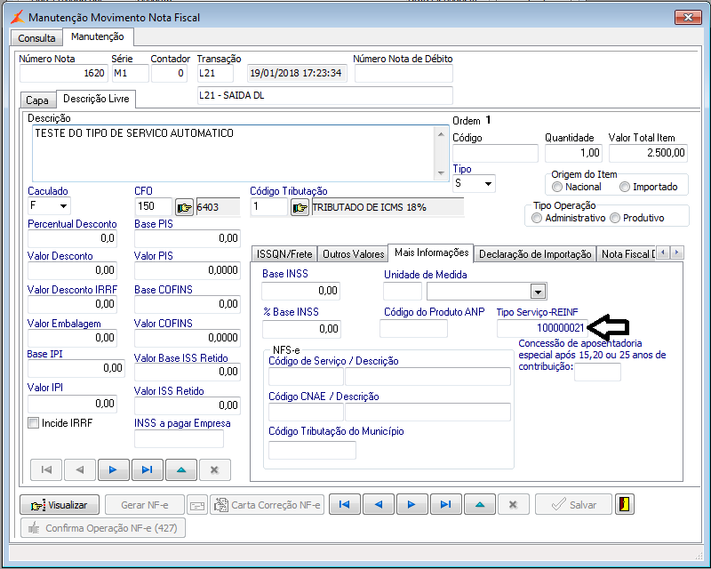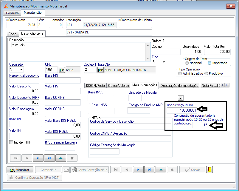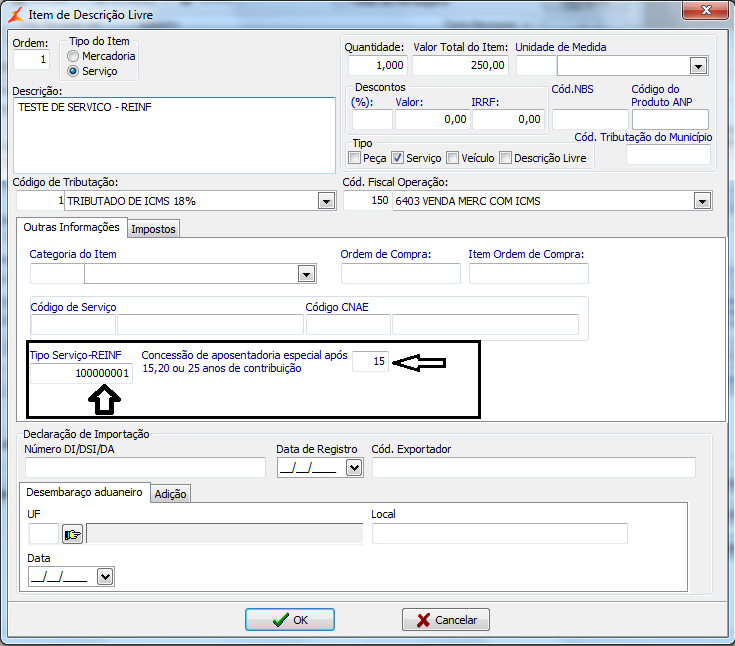 No Sistema, Menu (56350): Faturamento > Notas Fiscais > Notas Fiscais Descrição Livre, na requisição do item da nota de descrição livre, é possível informar as informações "Tipo Serviço-REINF" e "Concessão de aposentadoria especial após 15,20 ou 25 anos de contribuição".