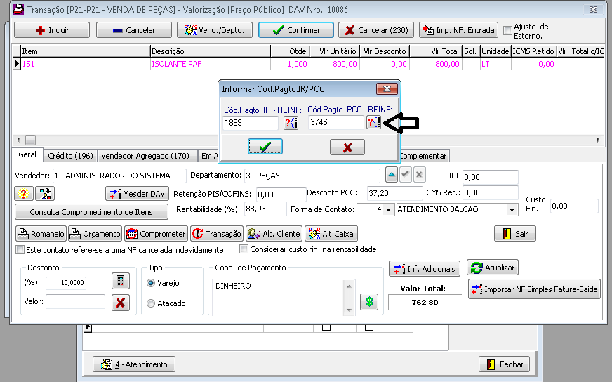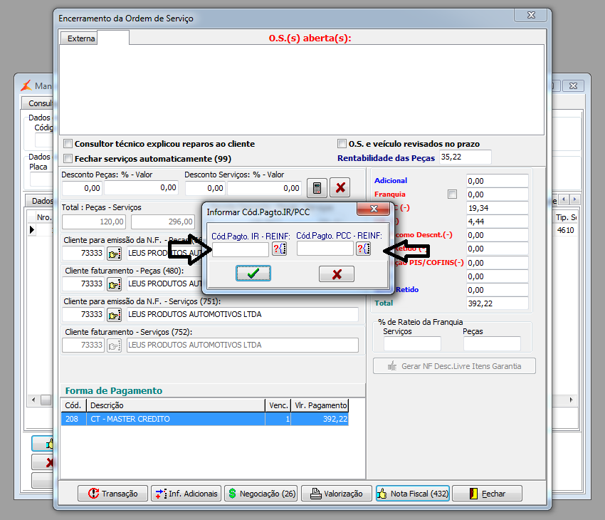 No Atendimento de Balcão, pelo Menu (81000): Peças > Atendimento Balcão, e nos encerramentos de O.S.´s, nos atendimentos de serviços e /ou peças com retenção do Imposto de Renda ou de PCC, também serão solicitados os códigos de pagamento do IR e do PCC, ao clicar no botão < Inf. Adicionais> e < Confirmar >. Veja as imagens: