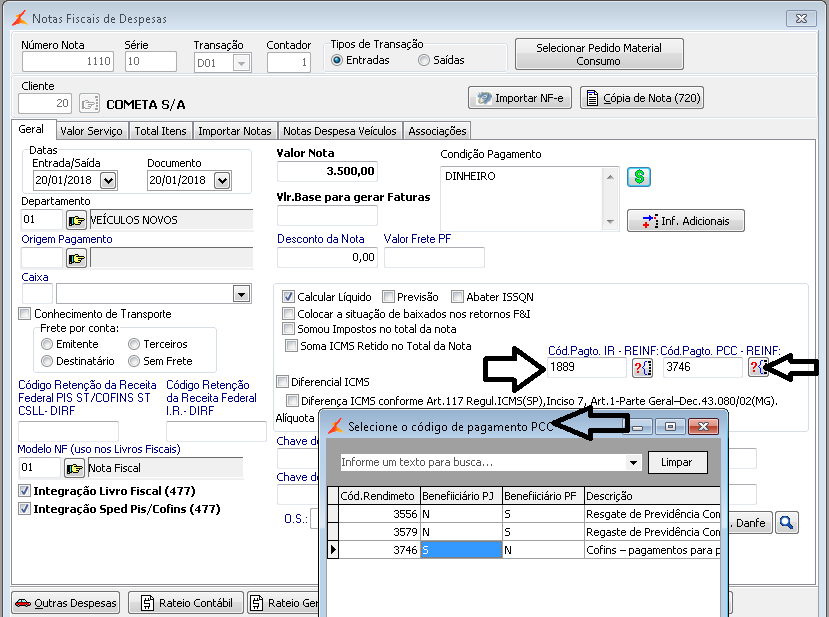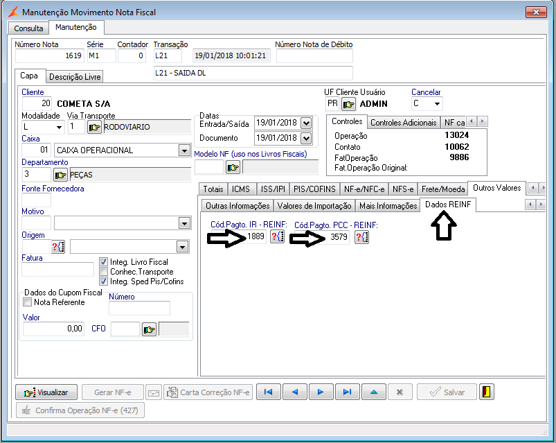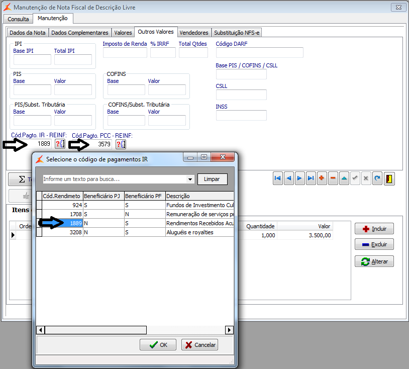 No Sistema, Menu (56350): Faturamento > Notas Fiscais > Notas Fiscais Descrição Livre, na aba < Manutenção > Outros Valores >, forma criados os campos < Cód.Pagto. IR - REINF: > e < Cód.Pagto. PCC - REINF: >. Nesses campos, será possível selecionar o código de pagamento, conforme os códigos selecionados no cadastro do cliente. Será possível selecionar somente um único código de pagamento nestes campos. Veja a imagem: