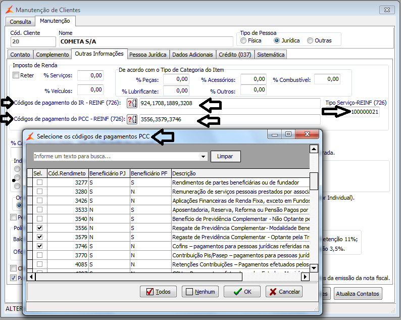 No Sistema, Menu (55910): Faturamento > Manutenção Clientes > Cadastro de Clientes, na aba < Manutenção > Outras Informações>, foram criados 2 campos, onde será possível selecionar os códigos de pagamentos do IR – Imposto de Renda – e do PCC – PIS ST / COFINS ST e CSLL – conforme Tabela 01 – Códigos de Pagamentos do REINF - possíveis de usar para este cliente nas operações com serviços no Sistema. Por exemplo, na geração das notas fiscais de descrição livre e de despesas, o usuário só conseguirá ver os códigos previamente selecionados no cadastro do cliente/fornecedor da nota/contato que está sendo gerado. Ao clicar no campo para selecionar o código de pagamento, serão mostrados todos os códigos existentes na Tabela 01 – Códigos de Pagamentos – do REINF. Estas informações estão disponíveis em uma tabela de dados, interna do Sistema, à qual não será possível dar manutenção. Para cada campo é possível selecionar vários códigos. Os diferentes códigos selecionados, aparecerão nos campos do cadastro do cliente, separados por vírgulas.