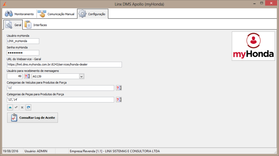 Usuário de acesso ao Webservice da Honda. Fornecido pela montadora. Senha de acesso ao Webservice da Honda. Fornecida pela montadora. - URL do Webservice – Geral