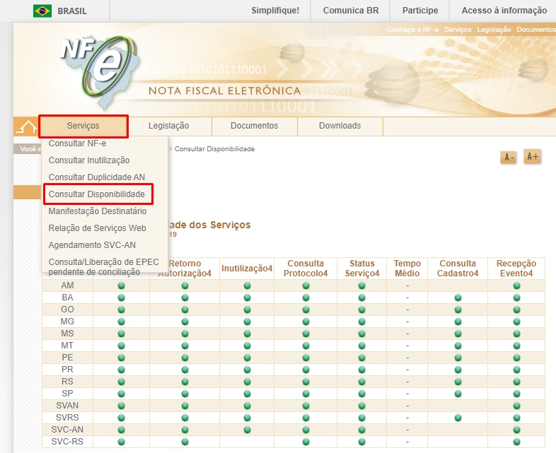 1.1. Para verificar a disponibilidade do seu estado, acesse o site da Sefaz através do link: https://www.nfe.fazenda.gov.br/portal/principal.aspx , clique em "Serviços" e "Consulta Disponibilidade". Nele irá encontrar o que cada status corresponde para trazer uma maior compreensão sobre o ocorrido.