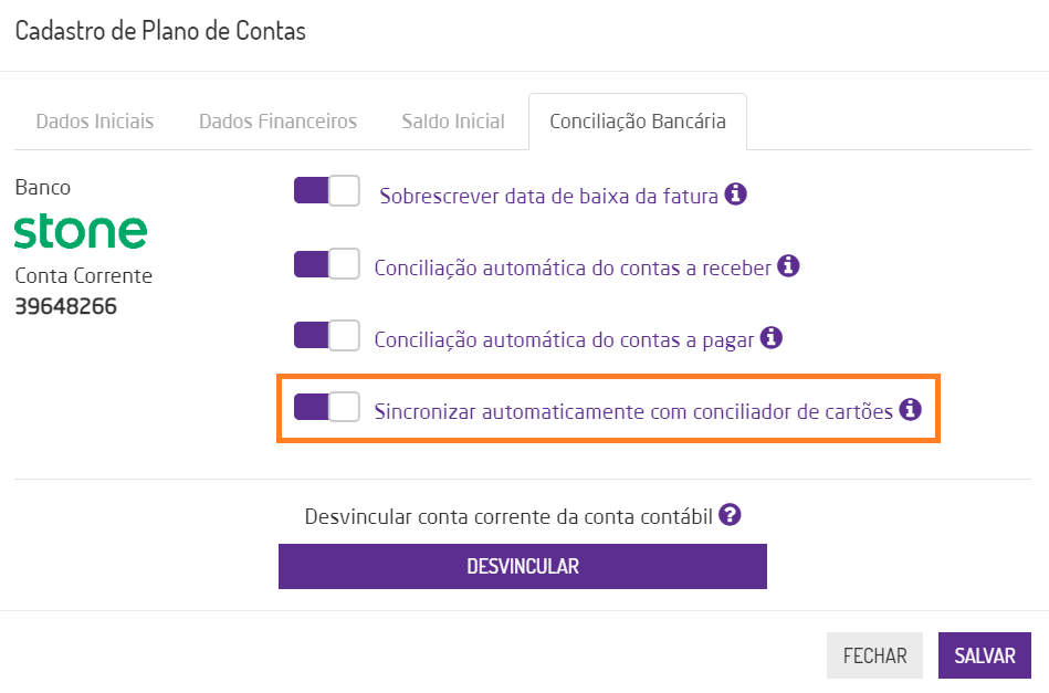 Este recurso estará disponível apenas para aquele que possuir o módulo do Conciliador de Cartões contratado. Ou seja, ativando o módulo, a sincronização do conciliador de cartão com o conciliador bancário será realizada automaticamente. Para isso, na listagem das contas do Conciliador Bancário clique no ícone de ferramenta da conta em questão > Na aba "Conciliação Bancária" marque a opção "Sincronização automática com o conciliador de cartões" e depois clique em "Salvar".