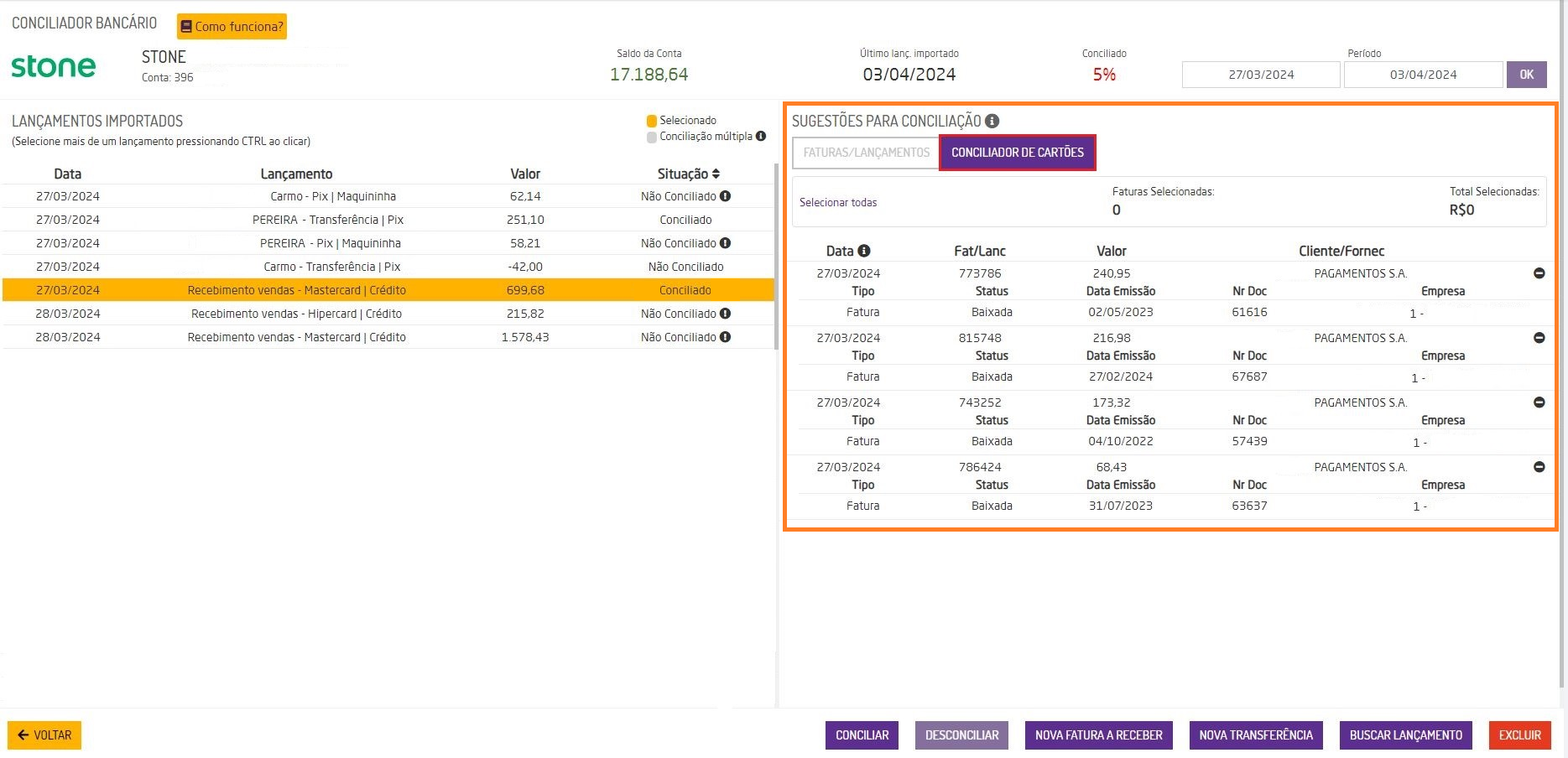 Ao acessar o Conciliador Bancário no canto direito da tela, você encontrará uma aba denominada "Conciliador de Cartões". Nessa aba, serão listadas as faturas que serão conciliadas com o extrato, localizado no lado esquerdo da tela.