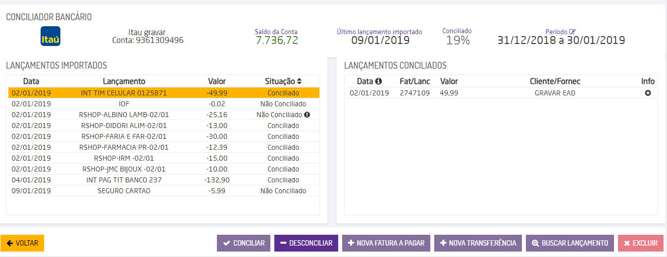 O rodapé disponibiliza algumas ações que auxiliarão na conciliação, como: Conciliar, Desconciliar, Nova Fatura a Pagar, Nova Fatura a Receber, Nova Transferência, Buscar Lançamento e Excluir.