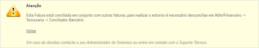 Regras exclusivas para estorno de faturas As faturas conciliadas e baixadas através do conciliador somente poderão ser estornadas por usuários com a permissão "Conciliação Bancária", desta forma, o lançamento do extrato ficará com o status "Não conciliado" e o lançamento contábil também será desfeito. Sempre que uma fatura for estornada, para que ela volte ao status "Conciliada" será necessário acessar a rotina novamente e realizar o vínculo com o lançamento. Para faturas lançadas diretamente no Conciliador, ao efetuar a desconciliação, ela será excluída. Para faturas conciliadas em lote não será possível realizar o estorno e o sistema exibirá a seguinte mensagem: