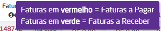 Situação: será apresentado o status da fatura, podendo ser "Aberto" ou "Pago"; Data: será apresentada a data do vencimento quando a fatura estiver "Em aberto" ou a data da baixa quando a fatura estiver "Baixada"; Fatura: será apresentado o número da fatura. Clicando sobre o ícone será exibida a informação das cores das faturas;