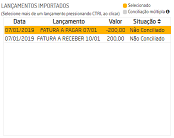 É possível realizar a conciliação de mais de um lançamento da mesma data ou de datas diferentes, basta pressionar a "tecla Ctrl" e selecionar nos lançamentos desejados. Após a seleção, ao lado direito, será exibido o valor total dos lançamentos e as ações disponíveis.