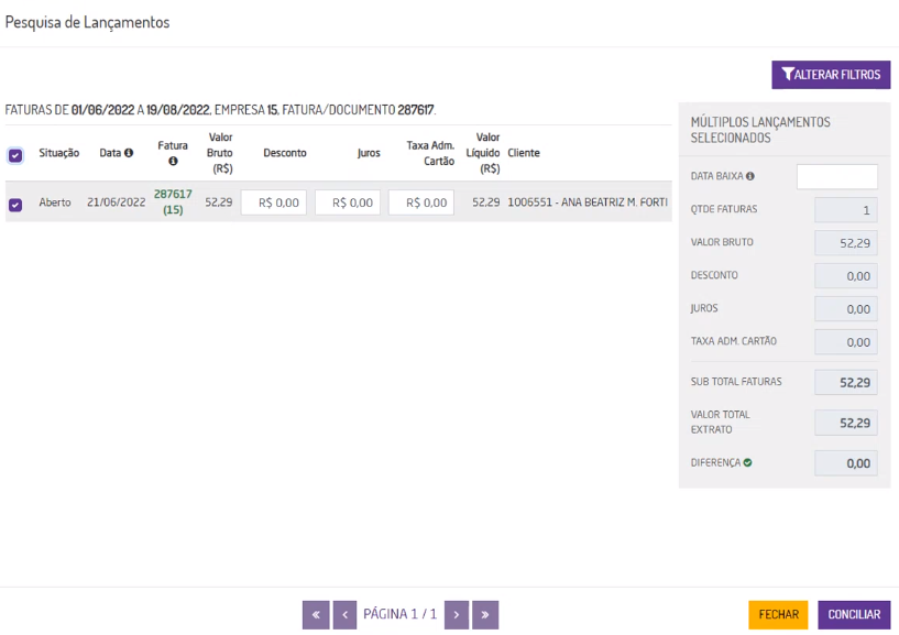 Quando não houver divergência de valores entre o extrato e o subtotal das fatura a conciliação pode ser realizada. Além disso, os dados das faturas conciliadas poderão ser observados no quadro "Lançamentos Conciliados".