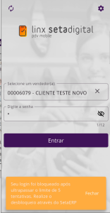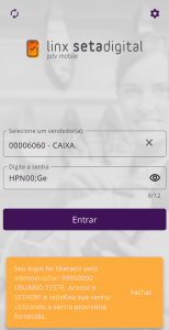 Caso queira usar a senha provisória antes de redefinir a senha no Linx Seta ERP no app, há uma validação que não permitirá usar o login no app Linx Setadigital PDV MOBILE
