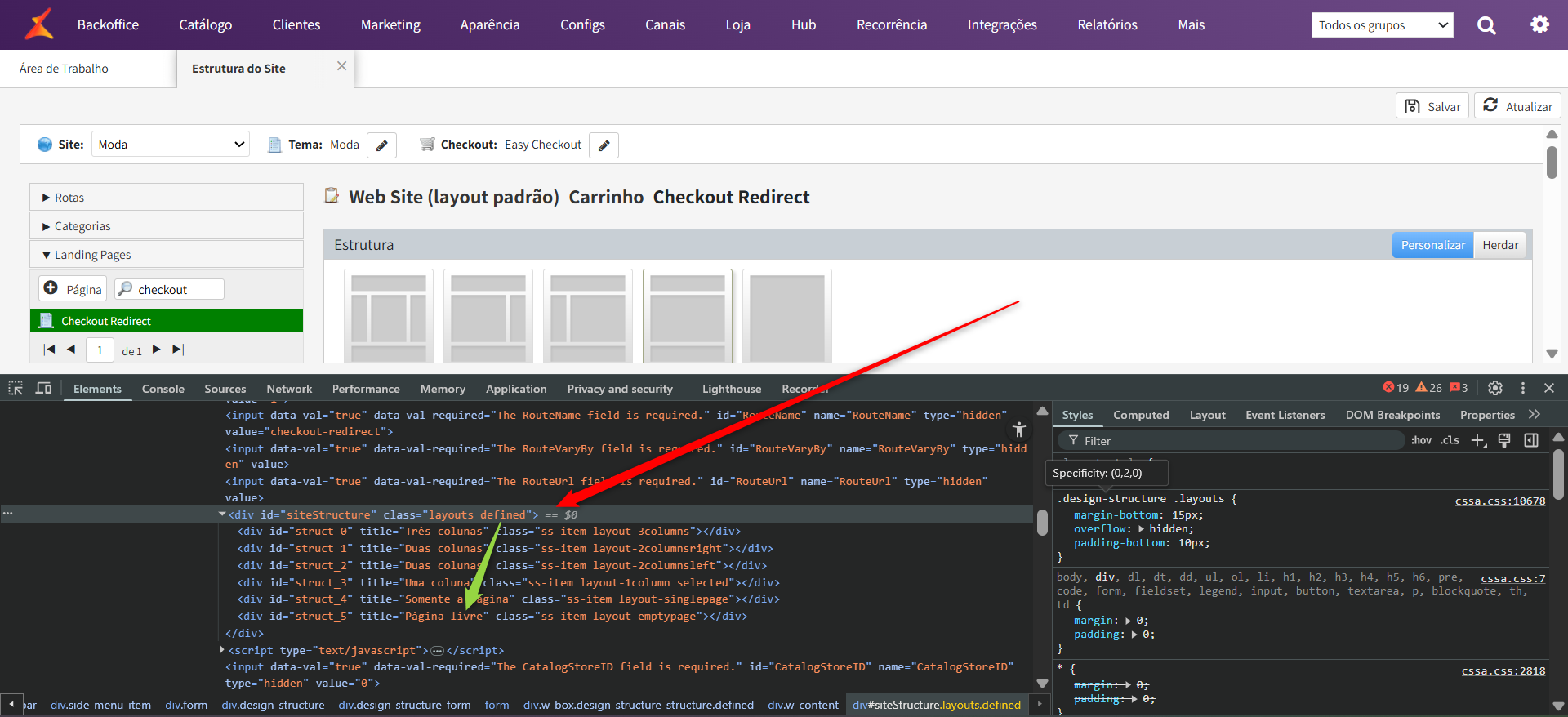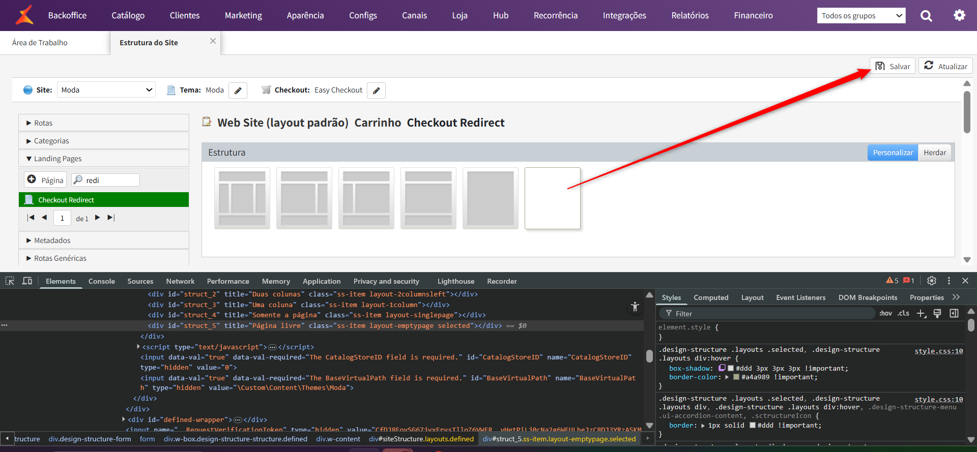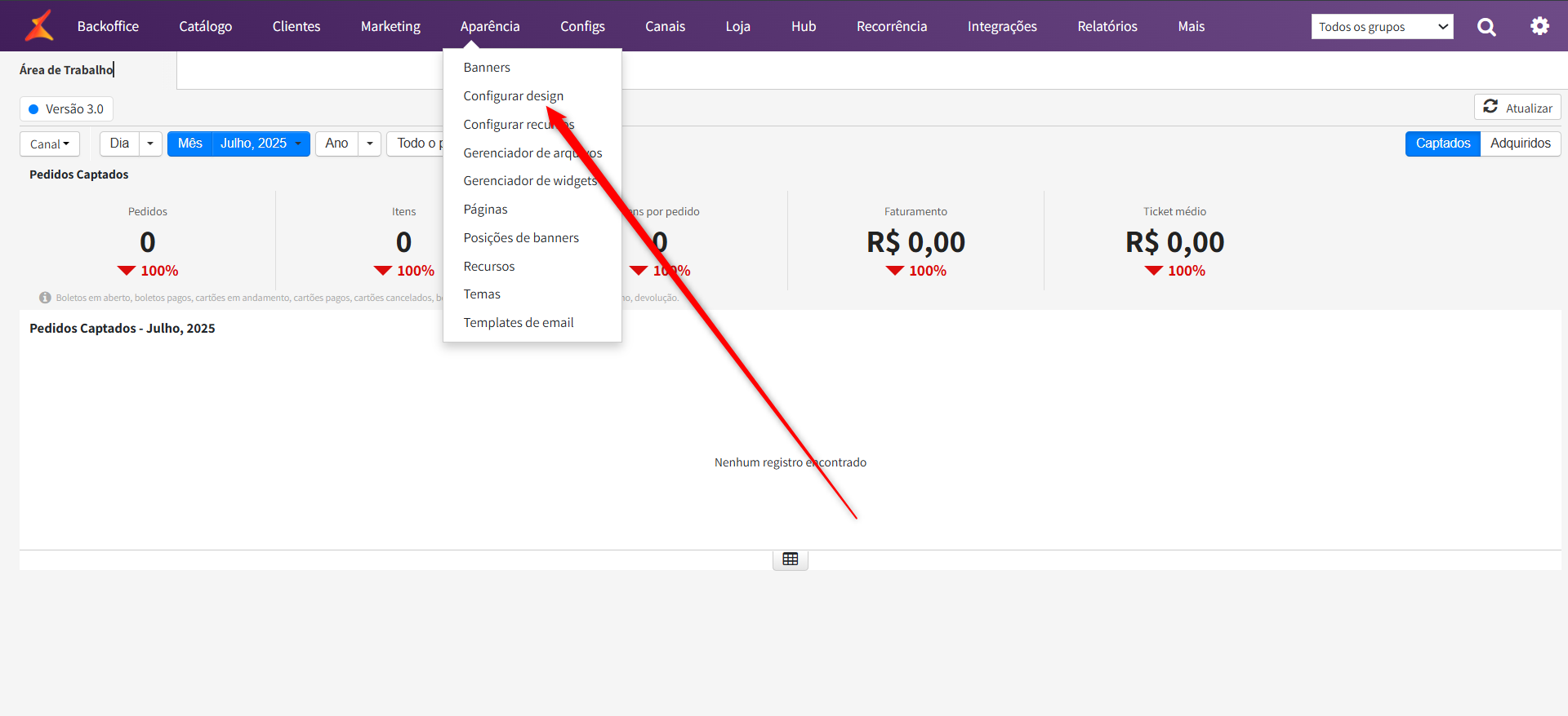 Após criarmos a rota de checkout redirect e o template do checkout redirect, vamos adicionar ao tema da loja. Para isso, acesse: Aparência > Configurar Desing: