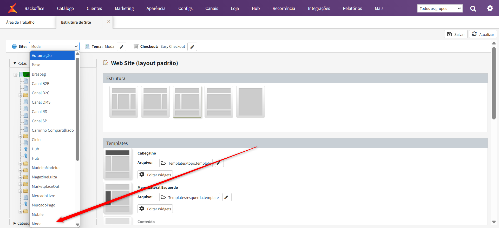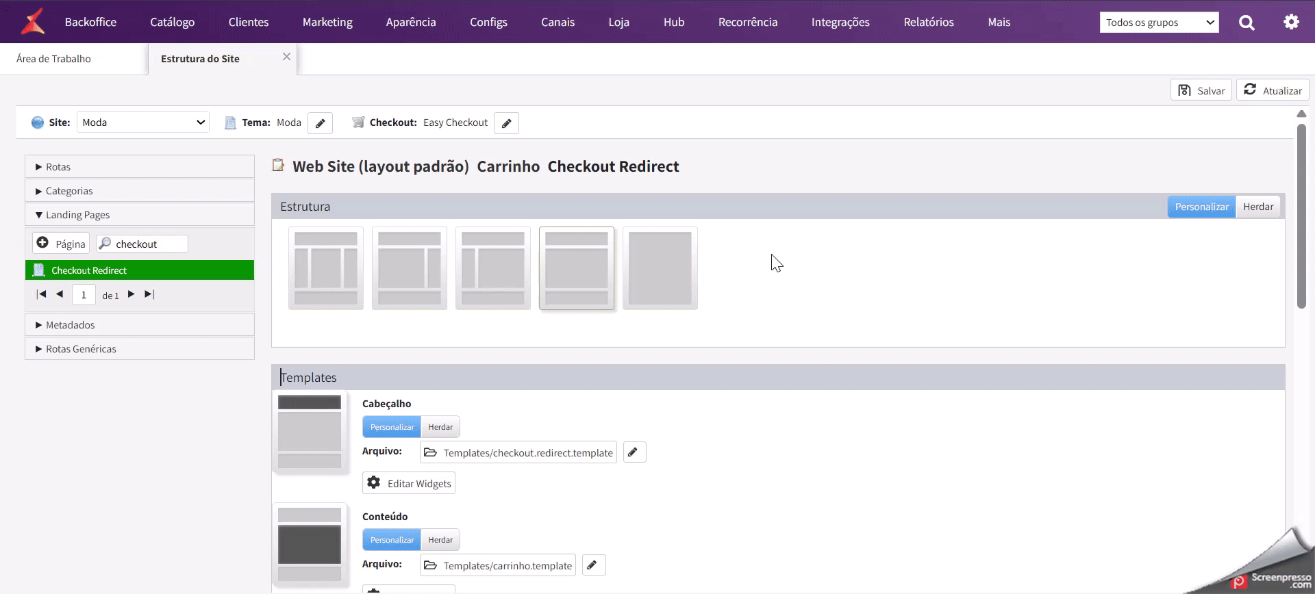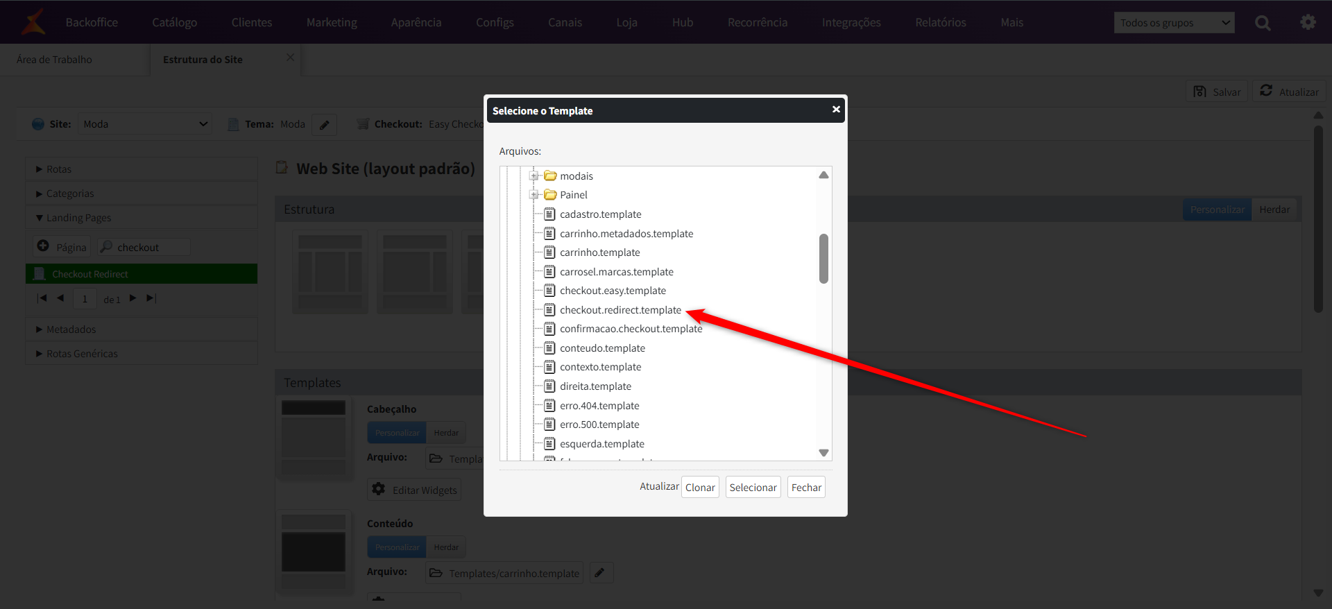 Será aberto um modal, e neste modal você irá selecionar o template criado "checkout.redirect.template", e clicar em "selecionar":
