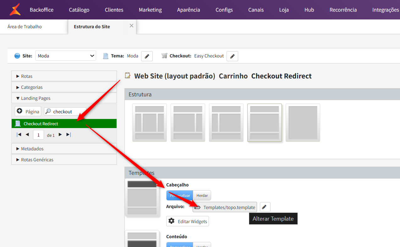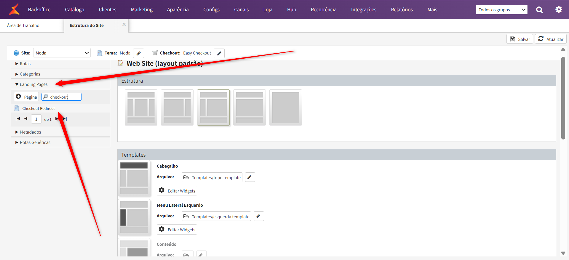 Acessar o menu "Landing Pages", e pesquisar pelo checkout redirect: