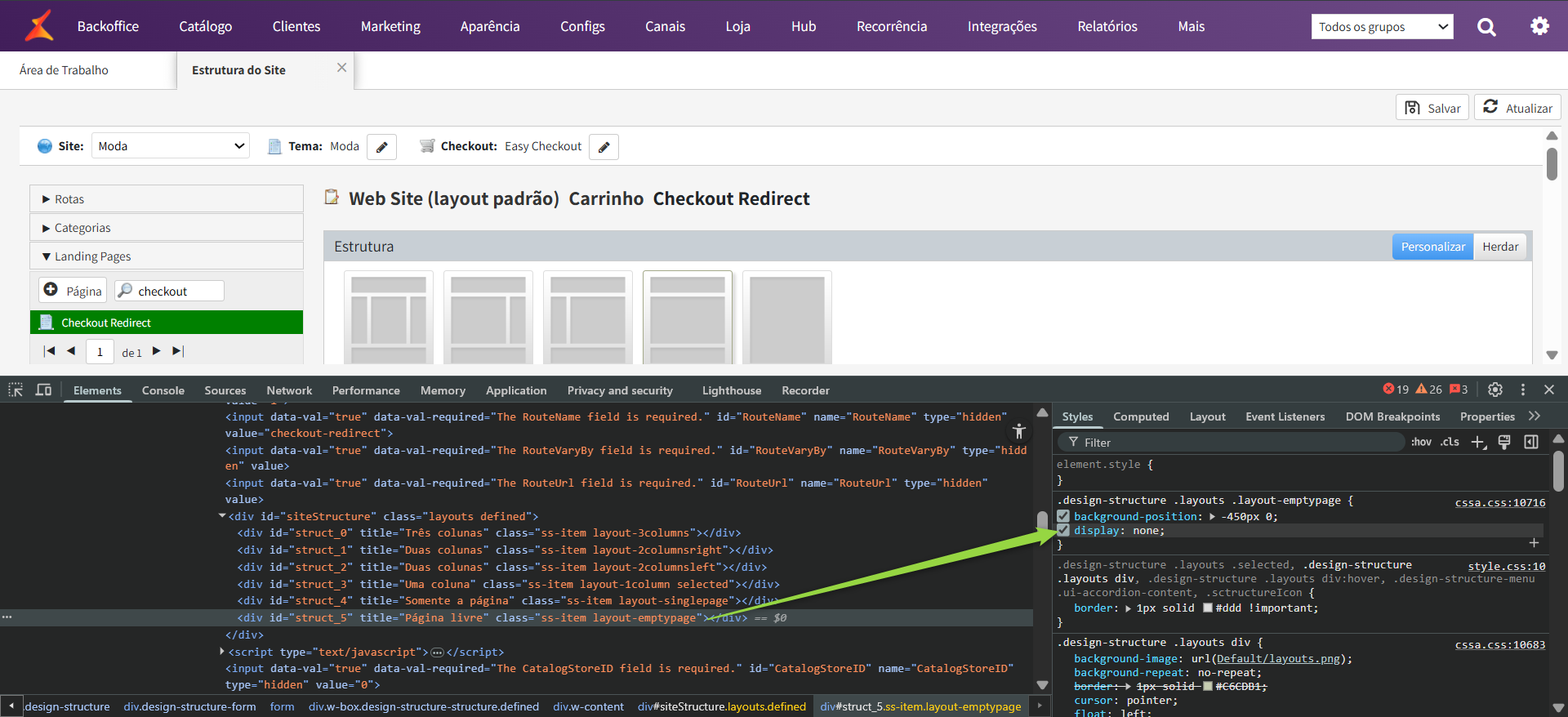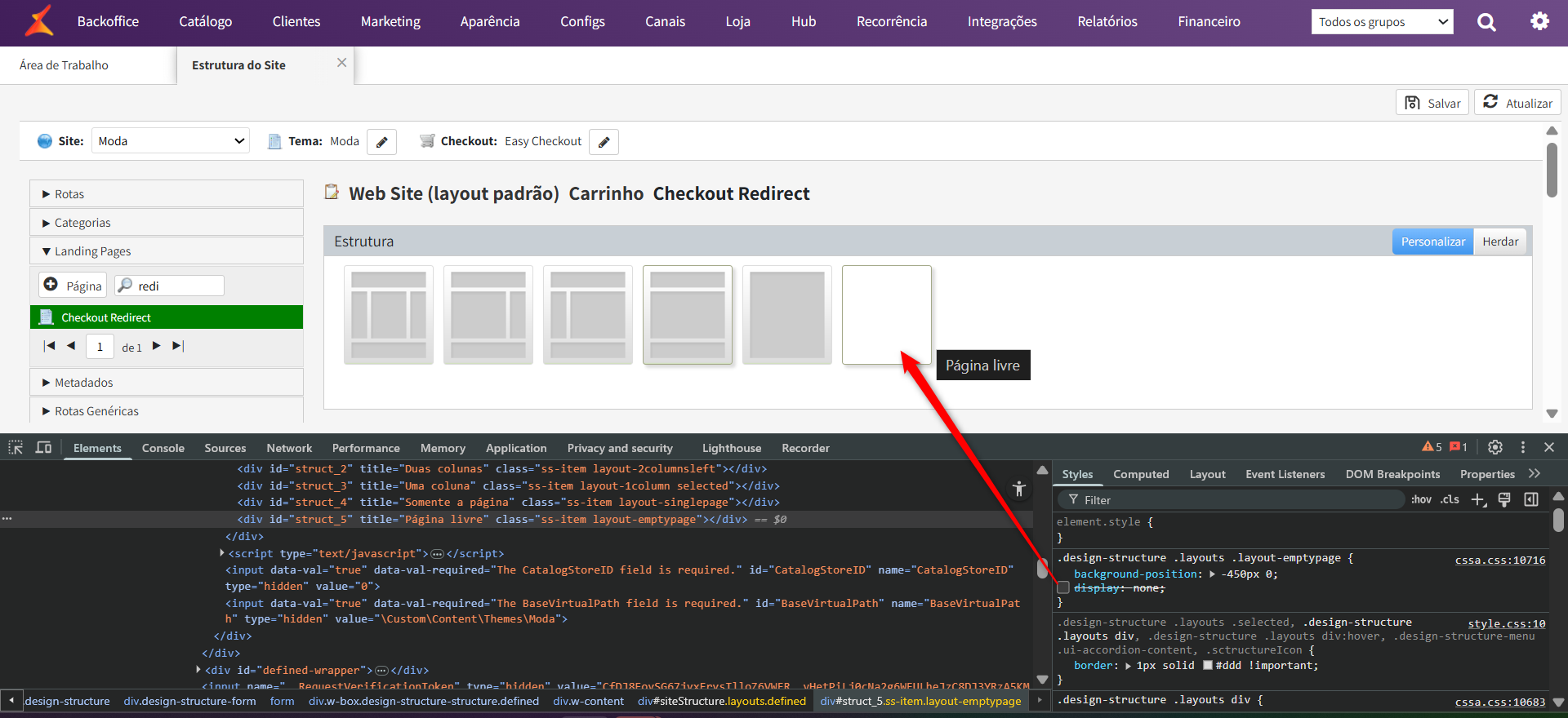 Selecionando a "Página livre", no menu "Style", localizará o display: none; e irá desmarca-lo:
