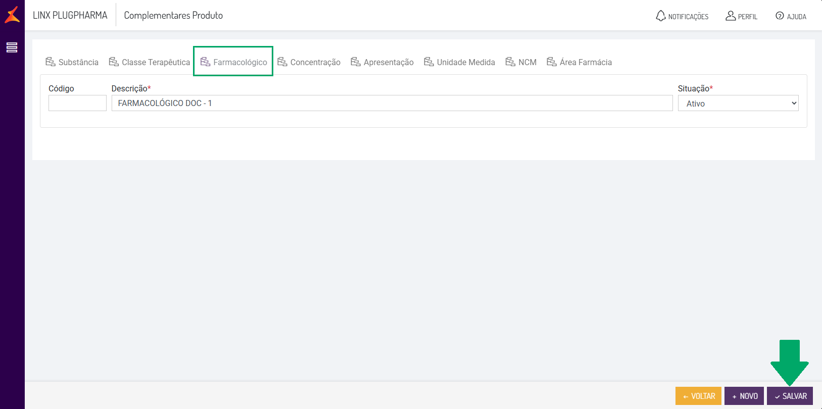 Para adicionar uma farmacológico nos dados complementares de produto, realize os passos a seguir: