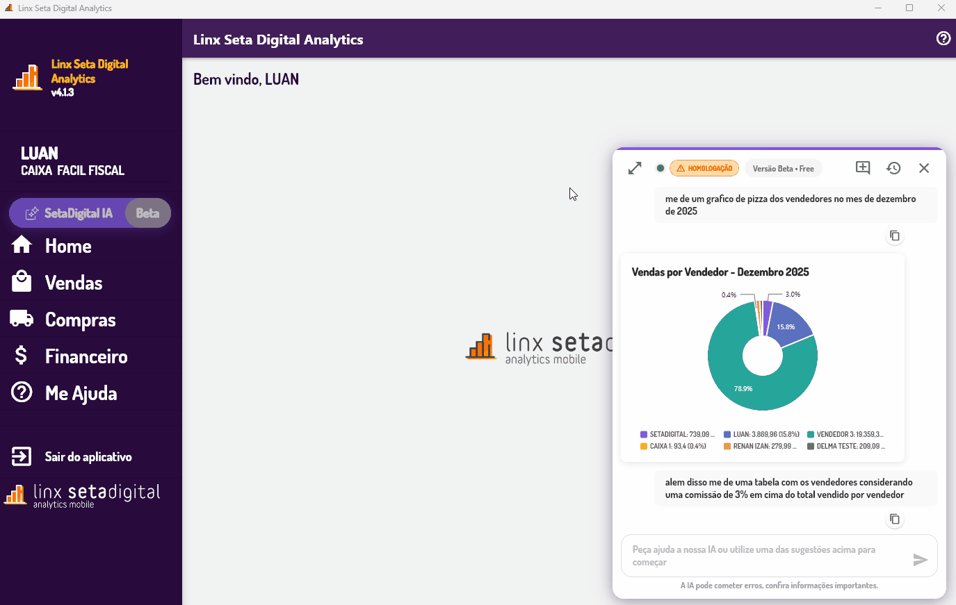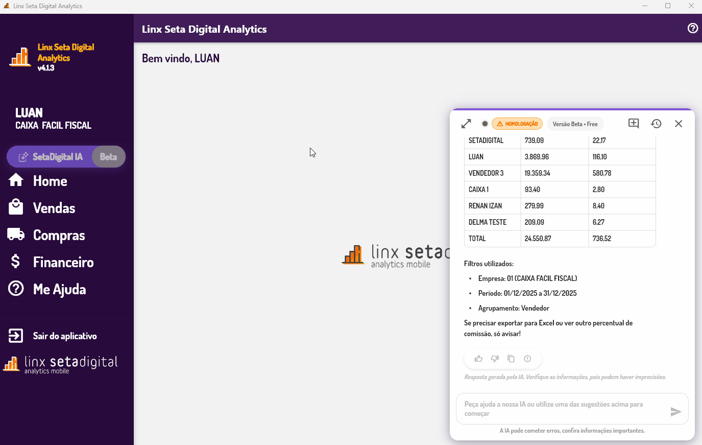 Acesse o SetaAnalytics na barra lateral do módulo Retaguarda do SetaERP, clique em SetaDigital IA e interaja com o chat para realizar consultas.