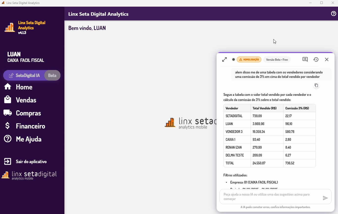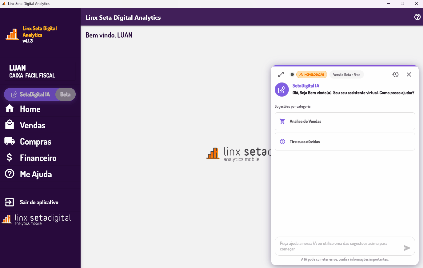 O Setadigital IA é uma ferramenta segura. Todas as respostas respeitam o contexto definido (vendas baixadas no SetaERP e conteúdos Linx Share).