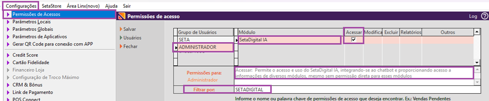 Para configurar as permissões de acesso a essa ferramenta, acesso o módulo Retaguarda > Menu Configurações > Permissões de acesso.