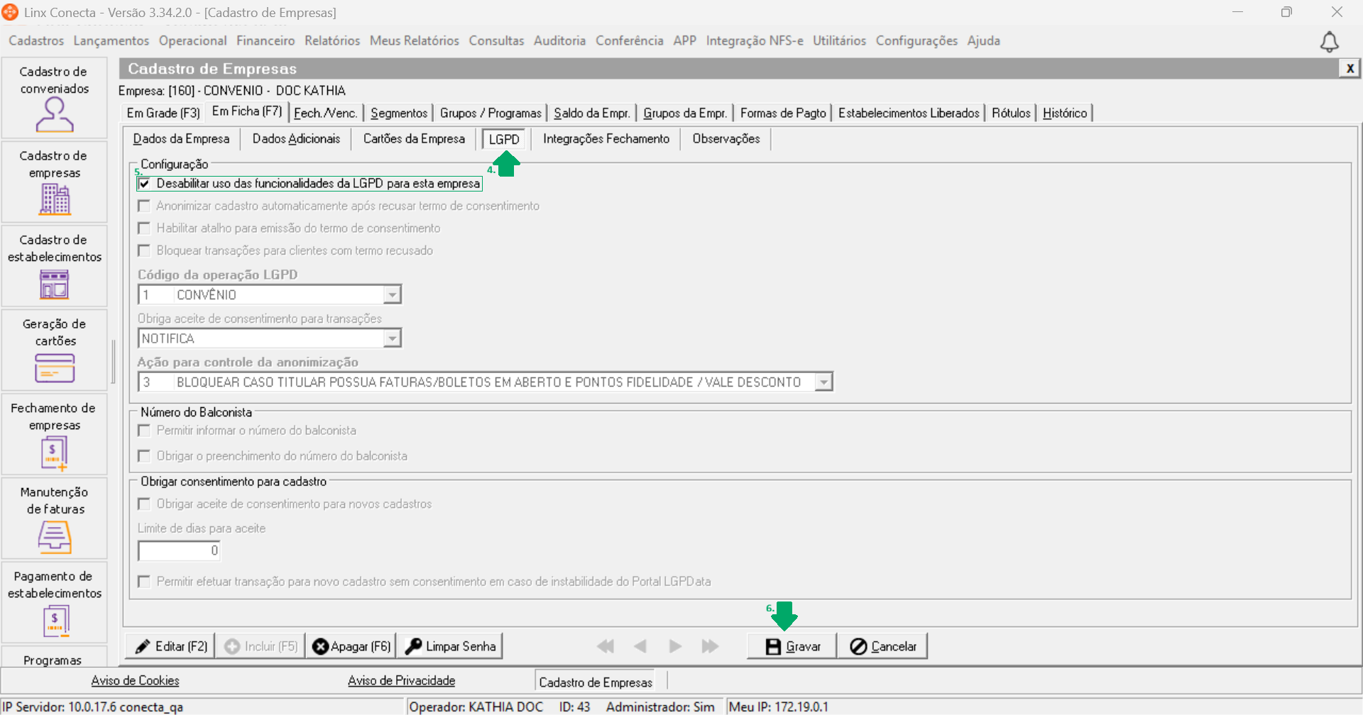 5. Marque a opção 'Desabilitar uso das funcionalidades da LGPD para essa empresa' e todas as funcionalidades utilizadas da LGPD serão desabilitadas para os cartões dessa empresa;
