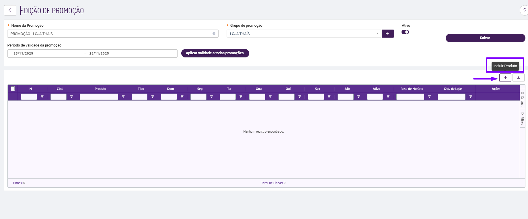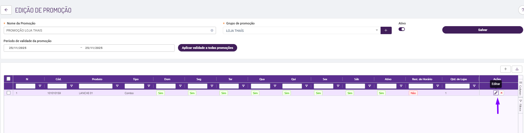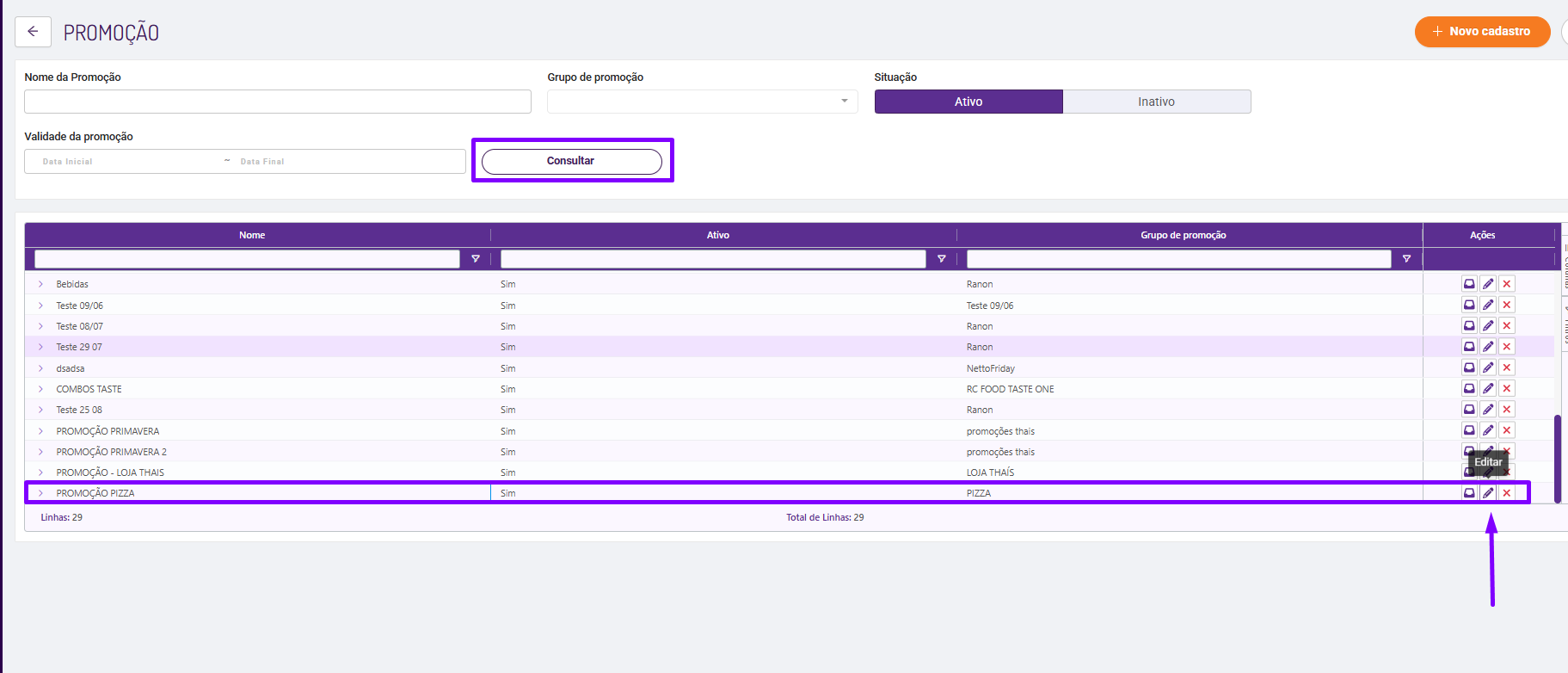 Com isso, retornará para tela inicial de promoção, clique em consultar para exibir todas que já estão cadastradas. Nesse caso foi cadastrada uma nova. Mas se desejar apenas editar uma promoção já existente ou incluir os produtos dentre as suas configurações, é necessário clicar no lápis para edição.