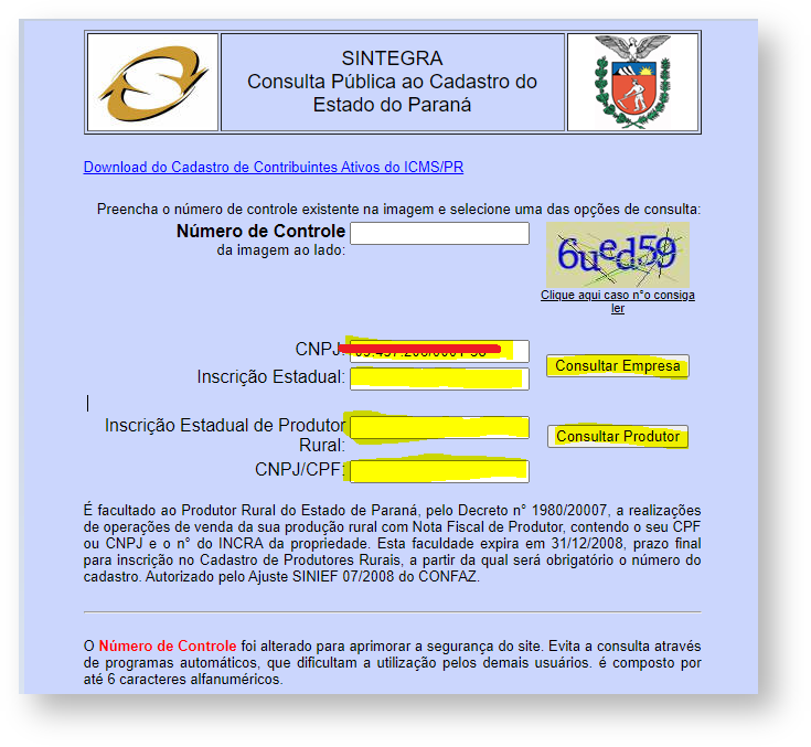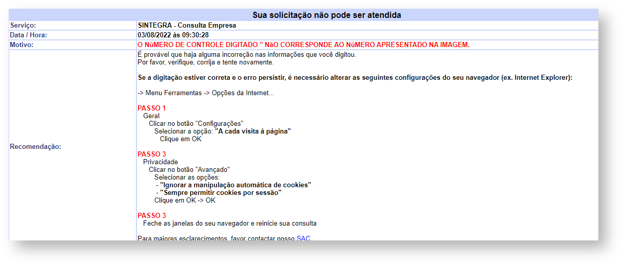 Caso ao consultar, o site apresente algum erro informando que o código (Número de Controle) foi inserido incorretamente, mesmo estando correto, utilize o navegador Internet Explorer.