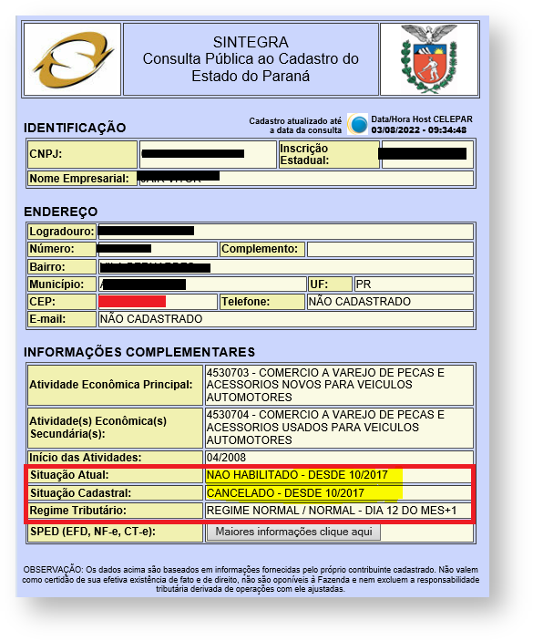 DICA - É possível obter maiores informações referentes a situação atual da IE do cliente através da consulta do CNPJ no site de serviços da Receita.