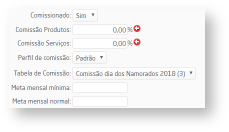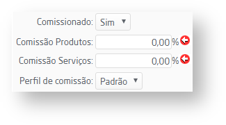 - Se marcado como "Sim", os campos "Comissão Produtos" e "Comissão Serviços" devem ser preenchidos (mesmo que com valor zero).