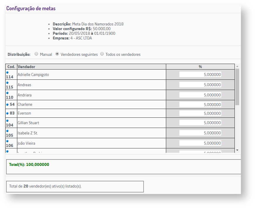 A rotina segue as regras específicas de metas e vendedores configuradas no sistema.