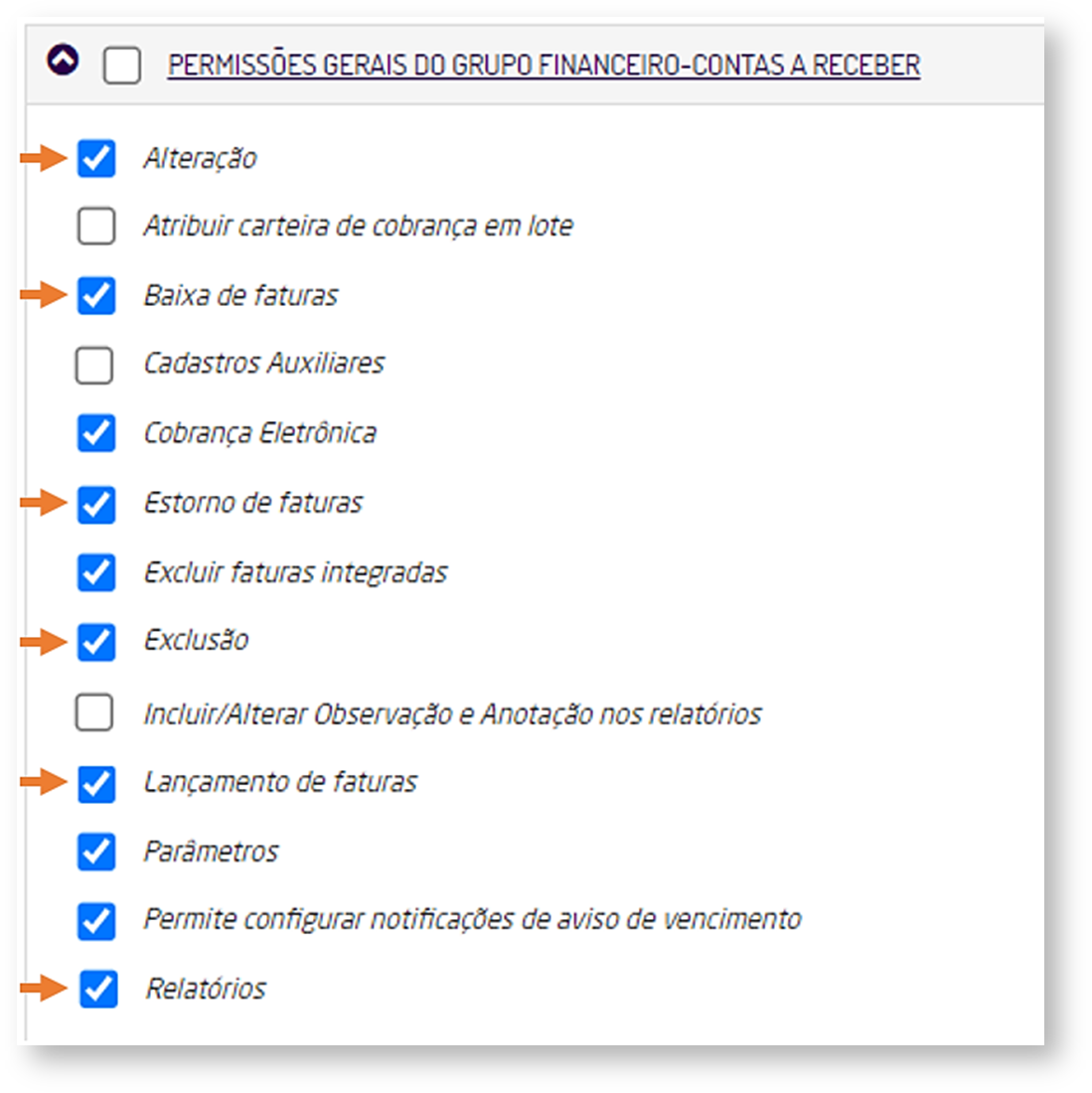 Para acessar a Gestão Financeira é necessário que pelo menos uma das permissões de acessos, esteja habilitada, no menu "Empresa > Segurança > Configurar Usuários > Listar > Configurar Permissões", nos grupos "Permissões Gerais do Grupo financeiro-Contas a Pagar" e "Permissões Gerais do Grupo financeiro-Contas a Receber", sendo elas: Alteração, Baixa de Faturas, Estorno de Faturas, Exclusão, Lançamento de Faturas e Relatórios, conforme o exemplo da figura abaixo.