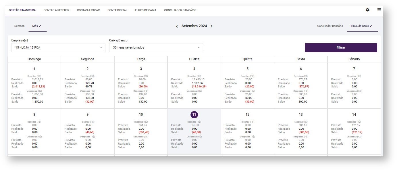 - Gestão Financeira: exibe um relatório em calendário para visualização semanal ou mensal, das visões de fluxo de caixa, e em breve, também do conciliador bancário;