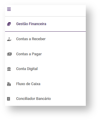 Ao clicar no ícone dos três tracinhos , temos acesso aos mesmos itens citados acima, porém, em forma de menu. Ao selecionar uma das opções, será aberta a sua respetiva tela de gestão.