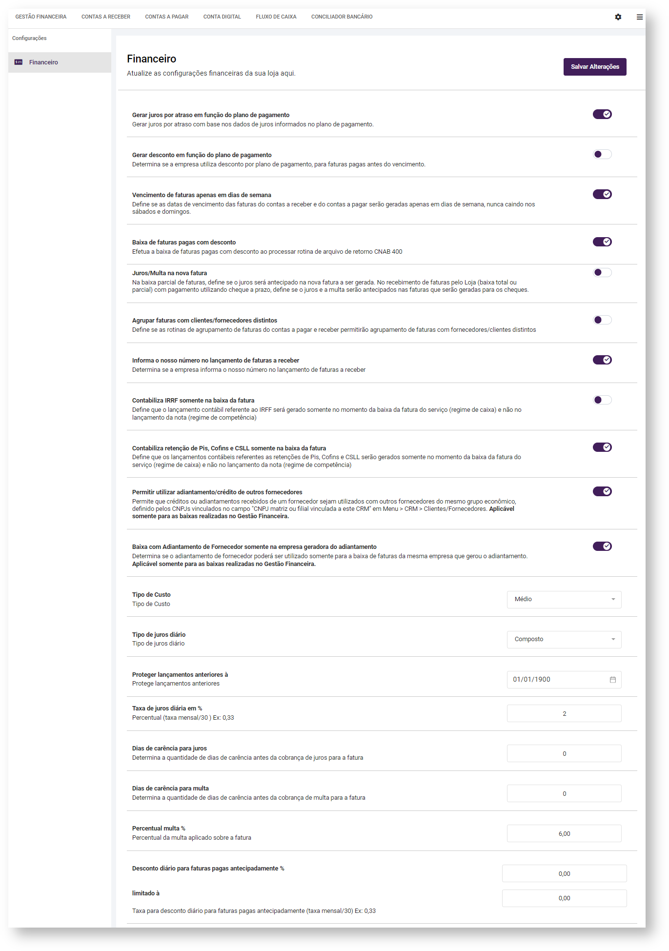 | Tipo de juros diário | Define o tipo de juros diário aplicado, sendo as opções: "Simples" ou "Composto" |