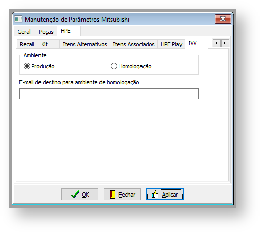 Neste menu é possível indicar se o processo do envio de e-mail do IVV será realizado no ambiente de produção (envio para a HPE) ou homologação (envio para o e-mail parametrizado no campo E-mail de destino para ambiente de homologação).