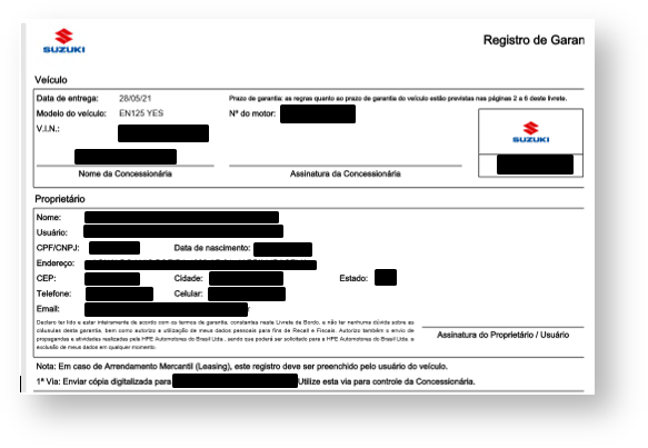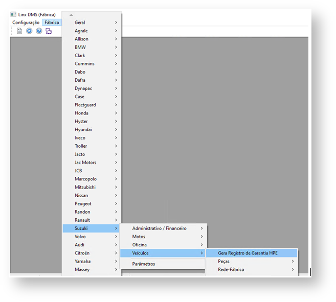 Acessar o menu "Fábrica > Suzuki > Veículos > Gera Registro de Garantia HPE"