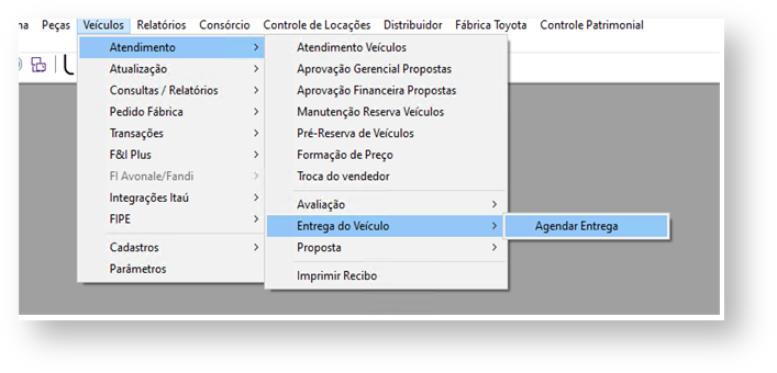 Acessar o menu "Veículos > Atendimento > Entrega do Veículo > Agendar Entrega" através do Linx DMS HPE
