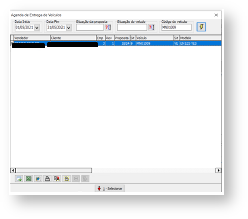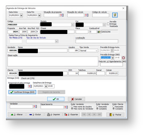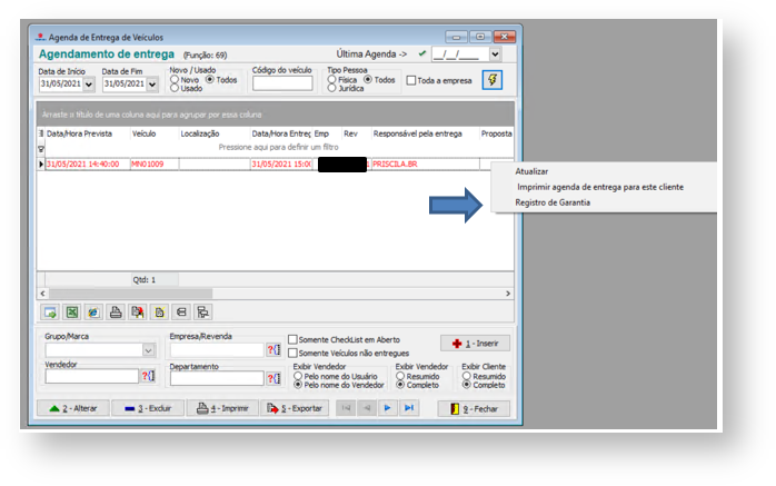 Observação: O menu " Registro de Garantia " só deve estar habilitado quando estiver selecionado no grid um agendamento com um "Veículo Novo" e "Data de Entrega" preenchida.