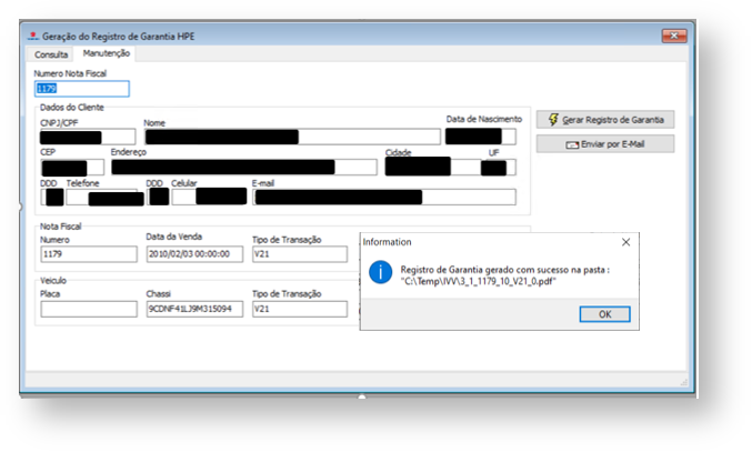 Clique em "Gera Registro de Garantia". Após a geração será apresentada na tela a mensagem informando o local onde o arquivo foi salvo.