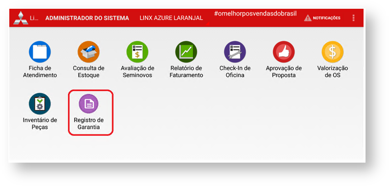 Acesse o app “Linx DMS Mobile HPE” com seu “Usuário” e “Senha”. Após, selecione o ícone "Registro de Garantia".