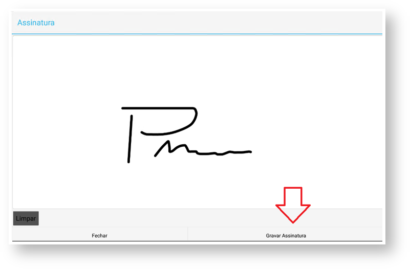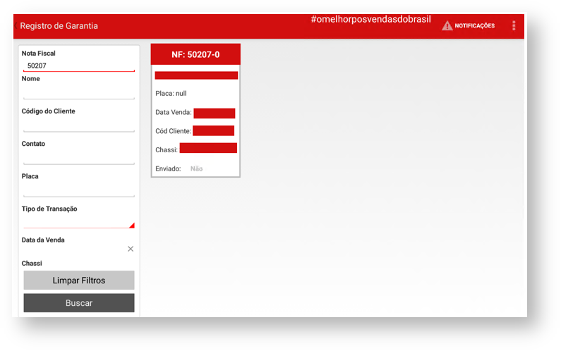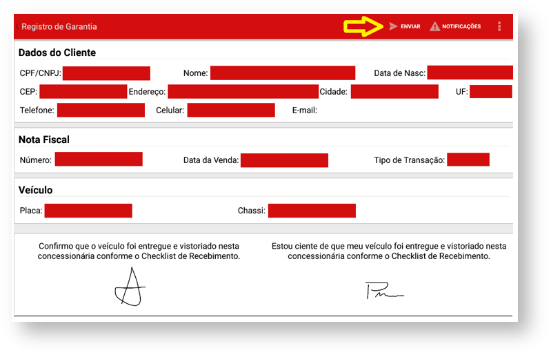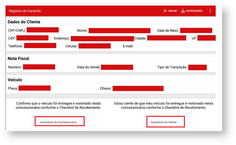 Após clicar no resultado apresentado, será listado o registro com mais detalhes do cliente e da nota fiscal. Nesta tela será coletada a “Assinatura da Concessionária” e “Assinatura do cliente”.