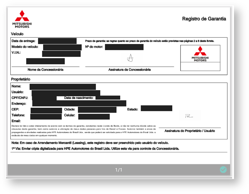 Após, será apresenta a tela do "Registro de Garantia" com as assinaturas gravadas.