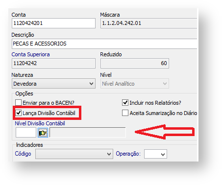 O Sistema só habilita a tela da divisão contábil na composição da digitação do Lançamento manual, caso no cadastro da conta contábil (menu Contabilidade > Cadastros > Conta) esteja selecionado o parâmetro "Lança Divisão Contábil" e seja selecionado o nível de divisão no campo "Nível Divisão Contábil".