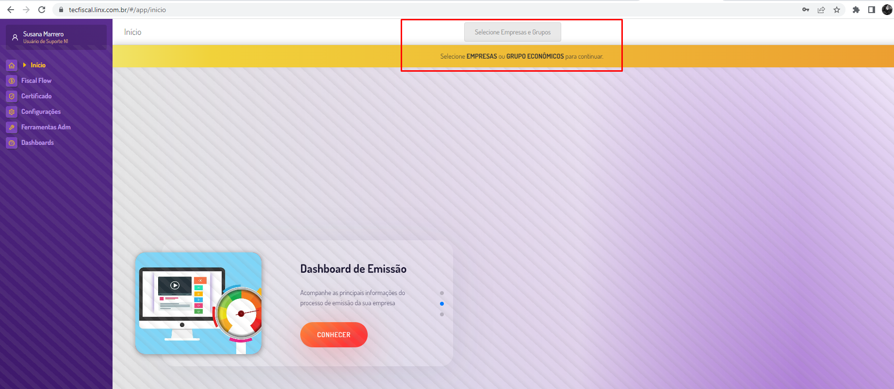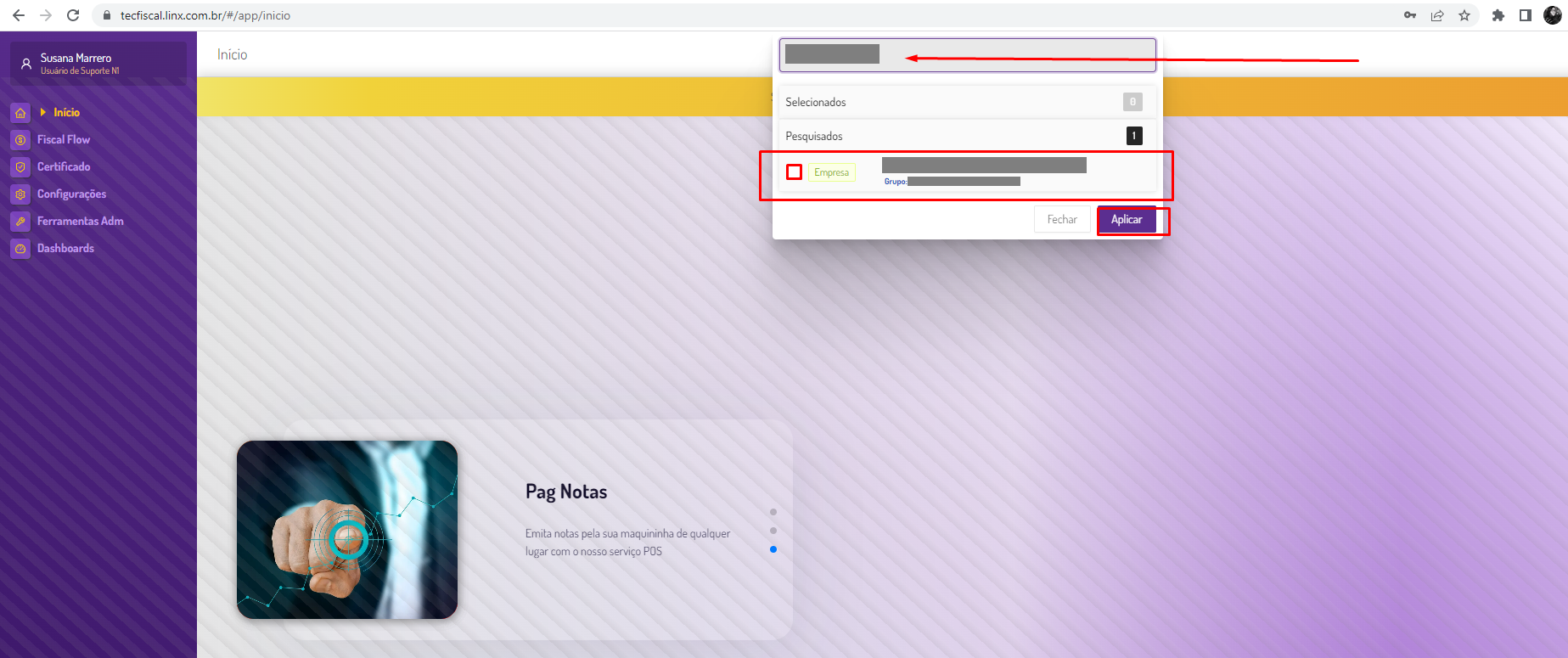 Passo 1 -acessar o site https://tecfiscal.linx.com.br/#/app/inicio > selecionar empresas/grupos.
