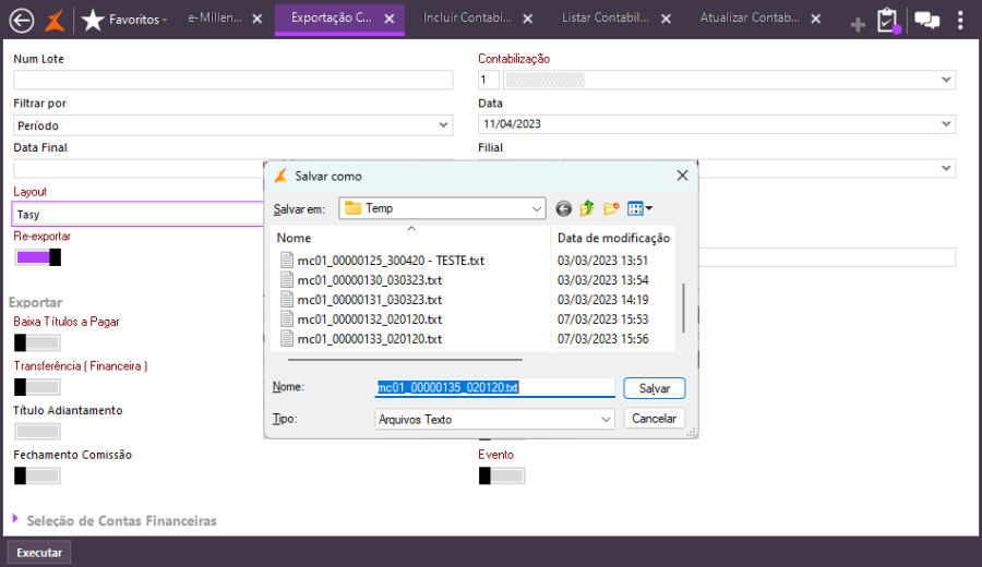 Após clicar em Executar, será realizada a consulta dos registros contábeis. Caso a consulta traga algum resultado, o sistema solicitará a indicação de um local para que o arquivo de exportação seja salvo.