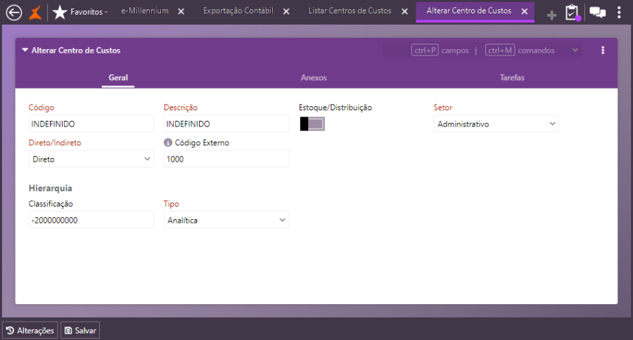 - Cadastre o código referente ao controle interno do Sistema Tasy que irá no arquivo de exportação contábil. Esse código deve ser informado em três telas do e-Millennium. Veja abaixo: