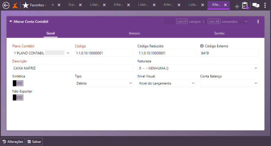 Observação: em cada linha do arquivo de exportação contábil pode conter um tipo de conta contábil, débito ou crédito. Veja o exemplo: