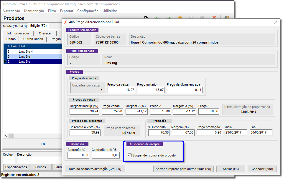 A suspensão de compras fica localizado no cadastro do produto na aba Preços Filiais onde a liberação/bloqueio era feito de forma individual e manual,